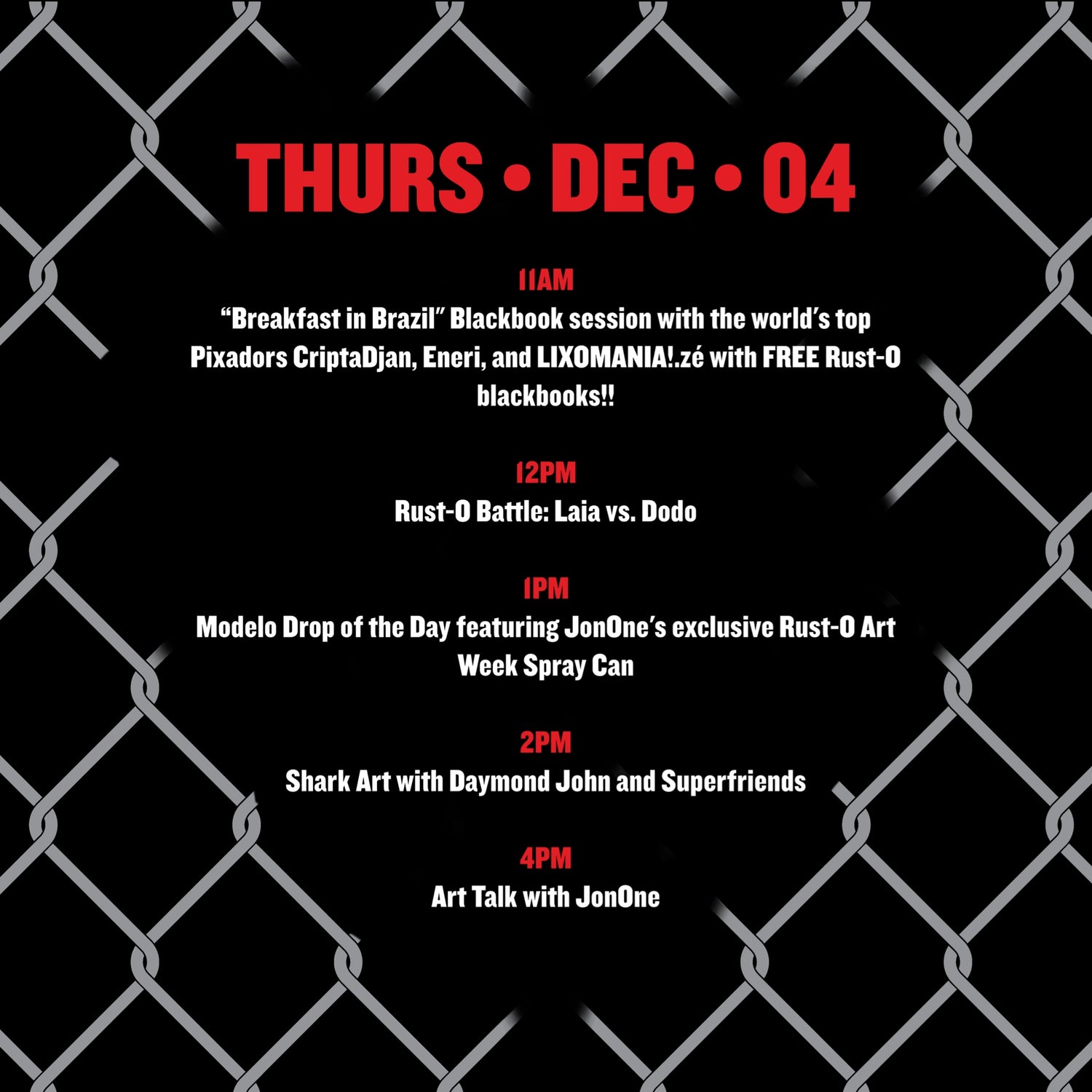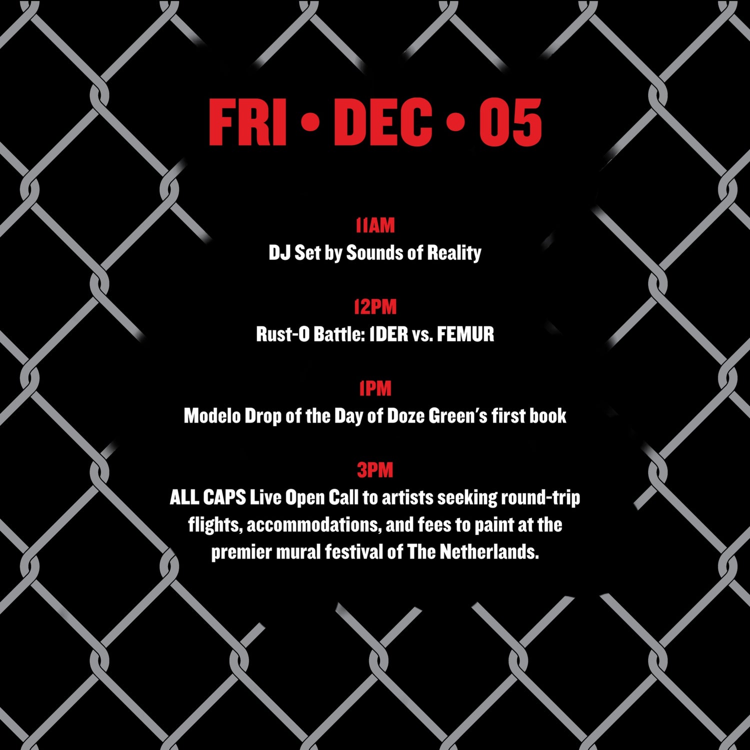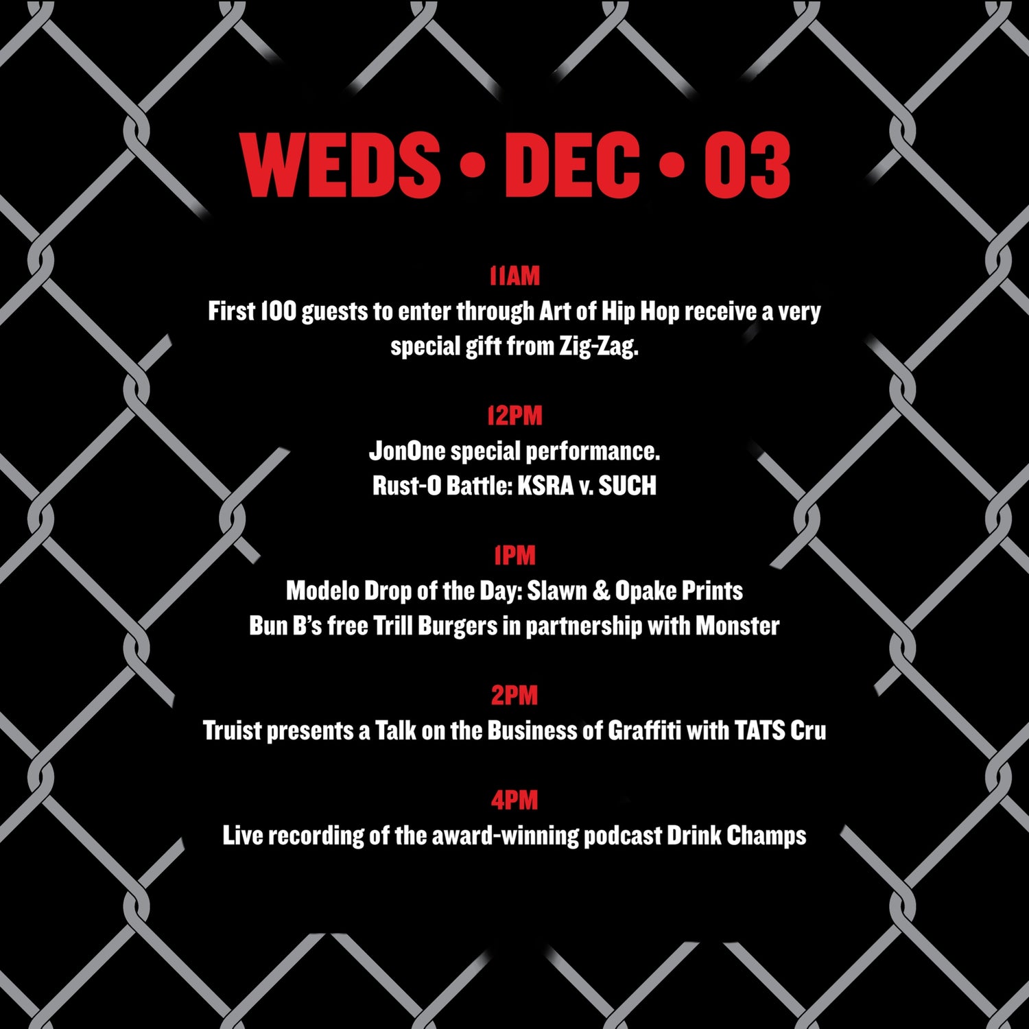 Join us on our interactive patio for daily Rust-O Artist Battles, the free Truist Art ATM with art from TATS Cru, complimentary AS Colour Tees customized by 4SAKN CBS, the Modelo Drop of the Day, a mocktail station courtesy of DryWater, our Zig-Zag Lounge with Curaleaf bud-tenders, free medical marijuana ID card appointments from Leafwell, and so much more! Tickets coming soon with tentative schedule as follows. Sign up for e-mails to be alerted to updates and ticket availability.